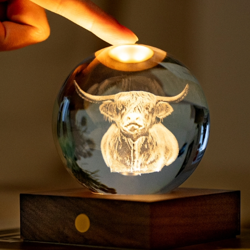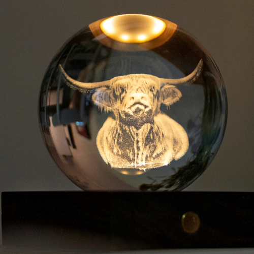 The New Gingko Design Highland Cow Amber Crystal Light features a 3D engraved iconic image of a majestic Highland Cow captured within an Amber Crystal sphere beautifully illuminated by it’s rechargeable Walnut base.
